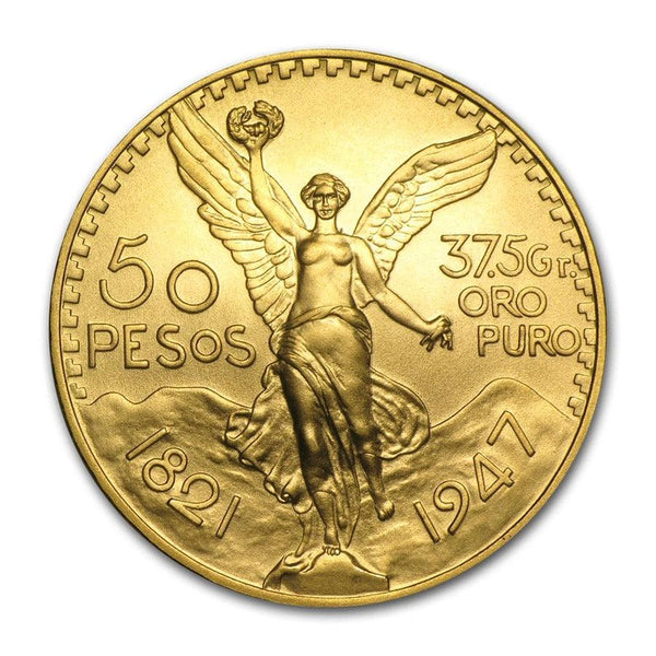 La fameuse pièce d'or mexicaine 50 Pesos est faite d'or pur à 900%. Elle a été frappée entre 1921 et 1972 et 12 507 654 d'exemplaires ont été émis pour célébrer l'indépendance du Mexique. Au début de sa commercialisation on nommait cette pièce « le mini Lingot »